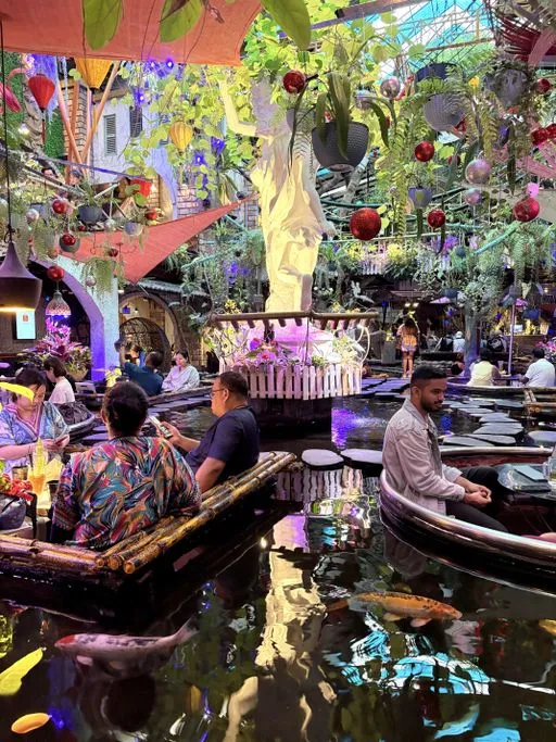 吃完去了一家内部环境很特别很好看的咖啡店,店里面有一个巨大的水池,水池上有座位,可以坐在座位上和旁边的鱼来一场亲密接触。里面可以点吃的和各种咖啡奶茶,喝的也不贵,一杯十几块钱左右。